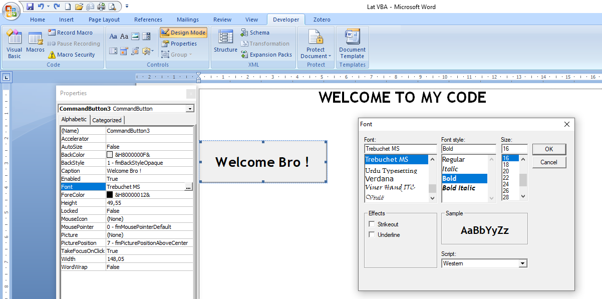 4. Cek kode program, non aktifkan menu Design Mode dengan mengkliknya. Setelah itu klik tombol [Welcome Bro], jika muncul input box seperti dibawah ini maka kode yang kita ketik berjalan lancar.